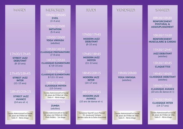 Nos cours ont lieu au Centre Administratif et Social (16 Place de l’Hôtel de Ville), à l’exception du Modern’Jazz au Complexe Sportif Laura Flessel (91 boulevard Voltaire).
